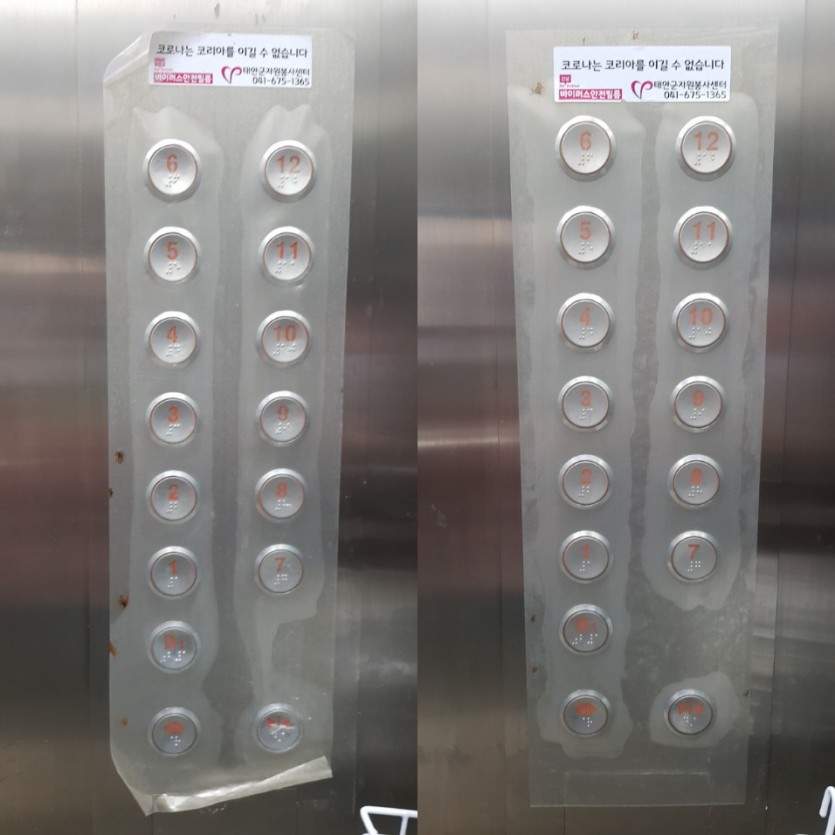 태안군자원봉사센터는 확산된 '코로나19' 예방을 위하여 지난 4월2일부터 16일까지 태안읍에 위치한 아파트의 엘리베이터 버튼에 구리가 함유된 항균필름을 부착했습니다. 그리고 3개월이 지난 현재, 항균구리필름을 부착한 아파트를 재방문하여 항균필름이 떨어진 곳에 보수하여 재부착 할 수 있도록 각 아파트 관리소에 항균구리필름을 전달하였습니다.