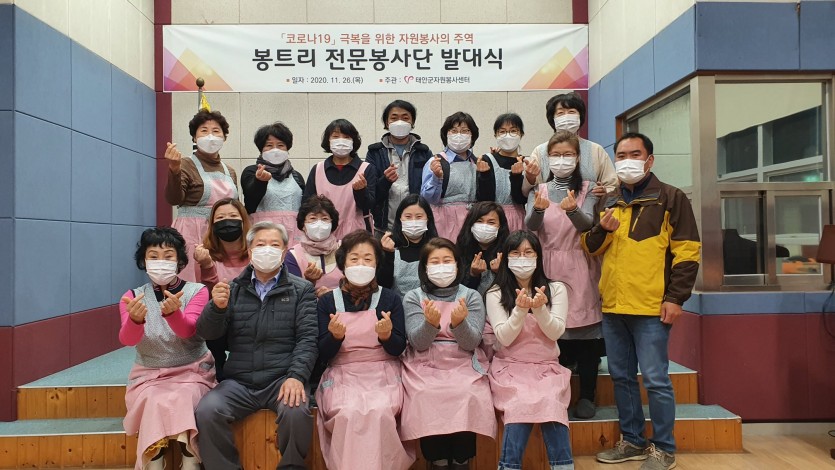 태안군자원봉사센터 에서는 『코로나19』 극복을 위한 자원봉사자의 주역 봉트리 전문봉사단 발대식을 진행하였습니다.
