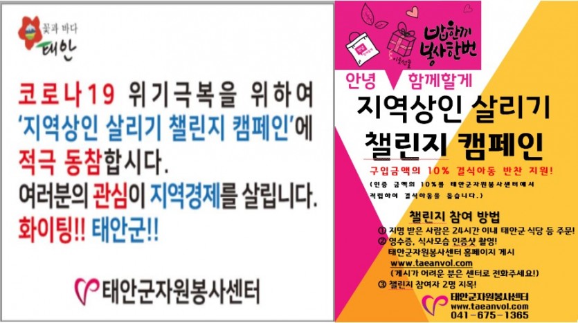 태안군자원봉사센터 에서는 코로나19 위기극복을 위하여 "지역상인 살리기 챌린지 켐페인"에 참여하여 코로나19 위기속 에서도 안전한 태안군과 지역경제를 위한