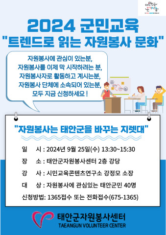 태안군자원봉사센터에서는 태안 군민들의 시민성을 고취시키고 자원봉사 문화를 정착시키기 위해 2024년 하반기 자원봉사 군민교육을 실시합니다. 많은 관심과 신청 바랍니다.~!