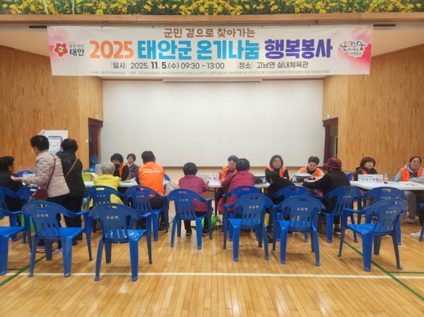 2025년 11월 5일(수) 태안군자원봉사센터에서는 고남면 실내체육관에서 군민 곁으로 찾아가는 "태안군 온기나눔 행복봉사"를 진행하였습니다.