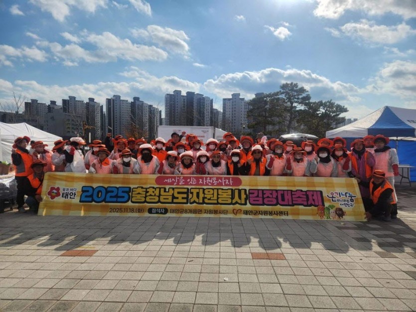 태안군은 11월18일(화) 충청남도청 남문 다목적 광장에서 열린 '2025 충청남도 자원봉사 김장대축제'에 8개 읍면 지역자원봉사단 총 45명이 참여했다고 밝혔다.
