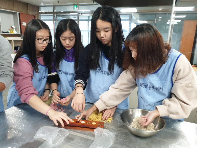 태안군자원봉사센터에서는 12.08.(일) 청소년들의 미래 자원봉사자 육성과 더불어 관내의 효자,효부 가정에 전달해 드릴 사랑의 다식 나눔 프로그램을 진행하였습니다.