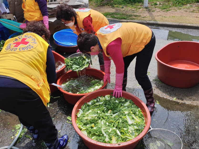 4월 7~8일에는 태안군자원봉사센터 소속인 ‘사랑의 밥차’와 ‘행복김치봉사단’의 자원봉사자분들께서 알타리를 손수 다듬고, 양념을 하여 맛있는 알타리 김치를 담갔습니다.