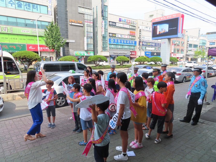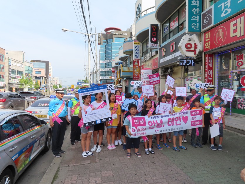 전국모범운전자연합회 태안지부와 함께 협조하여 초등생들과 태안종합터미널에서 진행된 안녕캠페인은