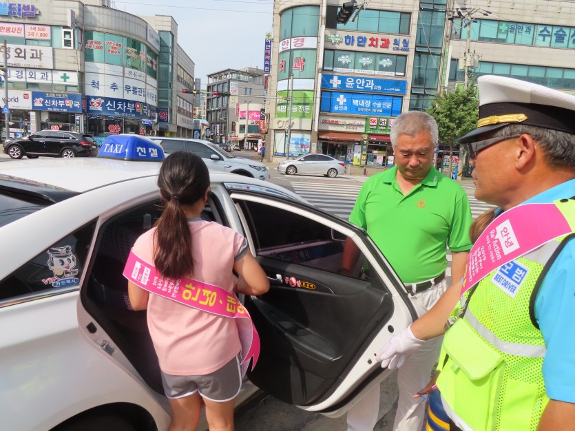 아이들이 직접 그리고 쓴 캠페인 소품을 택시들 조수석 뒤에 걸고 태안군민과 태안을 찾는 관광객을 대상으로