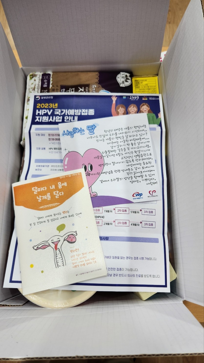다달이 필요한 위생용품과 엄마의 따뜻한 마음을 담은 쪽지를 전달하고있다.