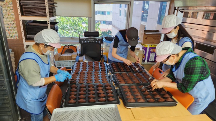 제빵 나눔 봉사는 일반봉사자 6명과 3명의 상담가 선생님이 참여하여 장애인학부모회 이용자 50명에게 초코마들랜을 만들어 음료와 함께 전달하였습니다.