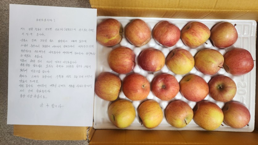 생활이 회복해 갈 즈음 연말, 태안군자원봉사센터에 청송사과 한 박스가 전달되었다. 사과 박스안에는 편지 한 장과 사과들이 정성되어 포장되어 들어있었다.