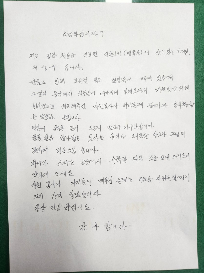 태안군자원봉사센터에 도착한 청송 이재민의 편지