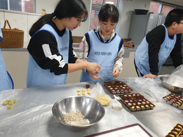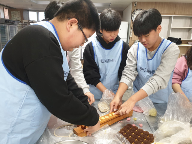 태안군자원봉사센터에서는 12.08.(일) 청소년들의 미래 자원봉사자 육성과 더불어 관내의 효자,효부 가정에 전달해 드릴 사랑의 다식 나눔 프로그램을 진행하였습니다.