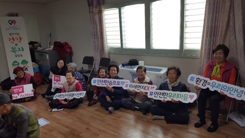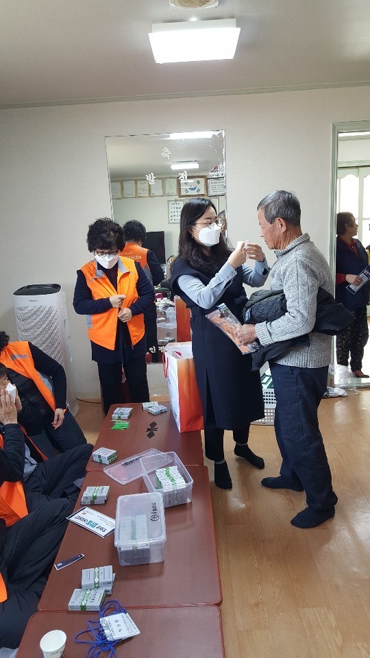 어르신들께 황사마스크와 마스크착용을 권유하는 스티커를 나눠드리고,