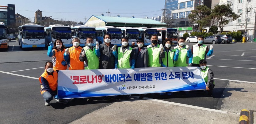 태안군자원봉사센터는 코로나19확산예방을 위하여 센터에 소속된 각 단체들과 함께 태안군시외버스와 시내버스를 중심으로 소독봉사 릴레이를 실시 중입니다. 금일 4월 14일 기준 제35회까지 실시했고 4월 29일까지 진행예정입니다.